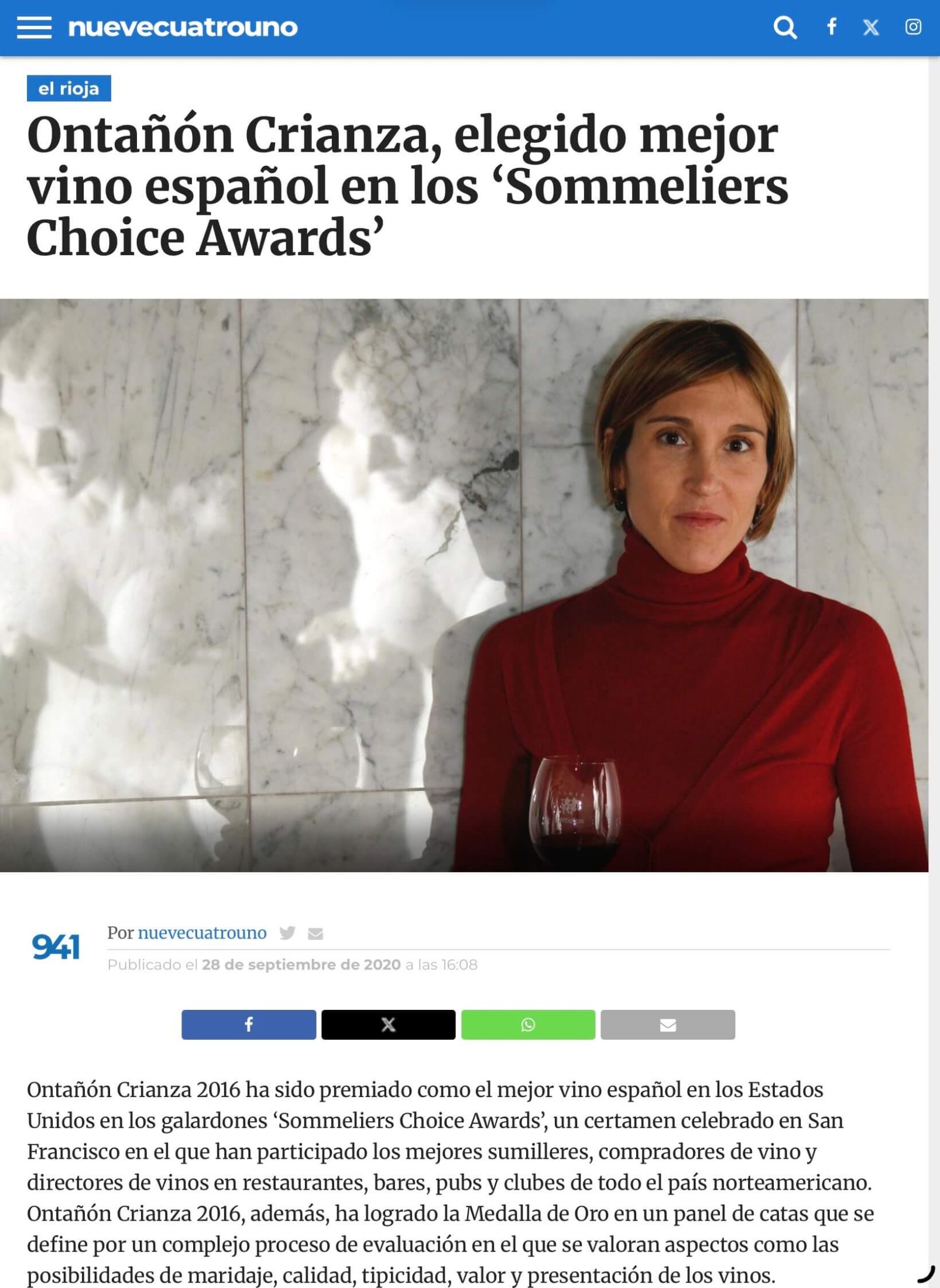 Ontañón Crianza, Mejor vino español en los Sommeliers Choice Awards. Nueve Cuatro Uno. por admin | Ene 26, 2026 | 0 Comentarios Enviar comentarioTu dirección de correo electrónico no será publicada. Los campos obligatorios están marcados con *Comentario *Nombre Correo electrónico Web Δ