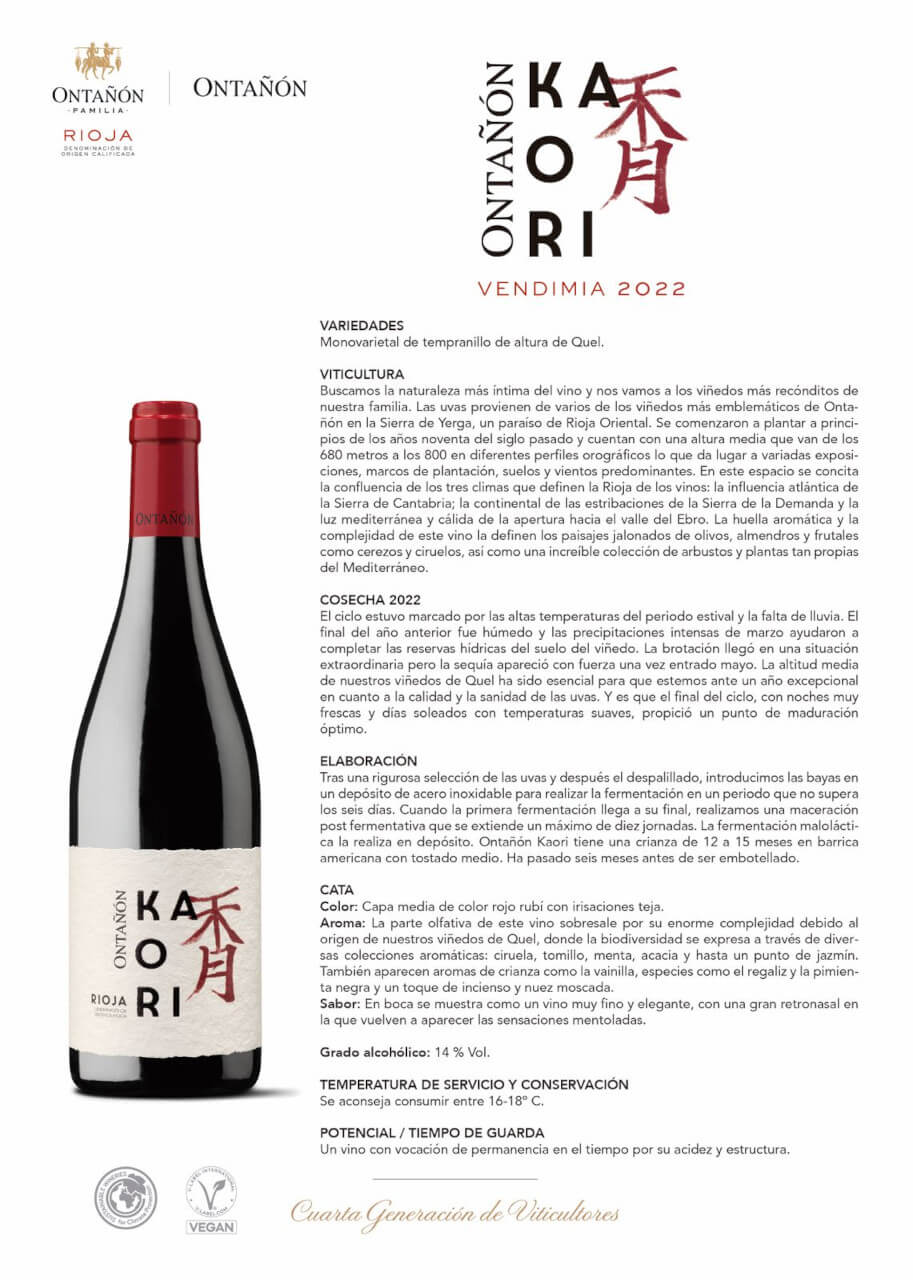 Ontañón Kaori supone elegancia, equilibrio y ahonda en la más fiel expresión aromática de un territorio (Quel, y sus viñedos de altura) y una variedad: tempranillo, que muestra la belleza de sus taninos y la frescura de su origen en viñedos situados en lugares privilegiados: altura, suelo y un entorno de enorme biodiversidad en el que las vides se sitúan a pie de bosque rodeadas de un fascinante entorno aromático. La complejidad de su perfume y la finura de su expresión definen la huella de este vino.